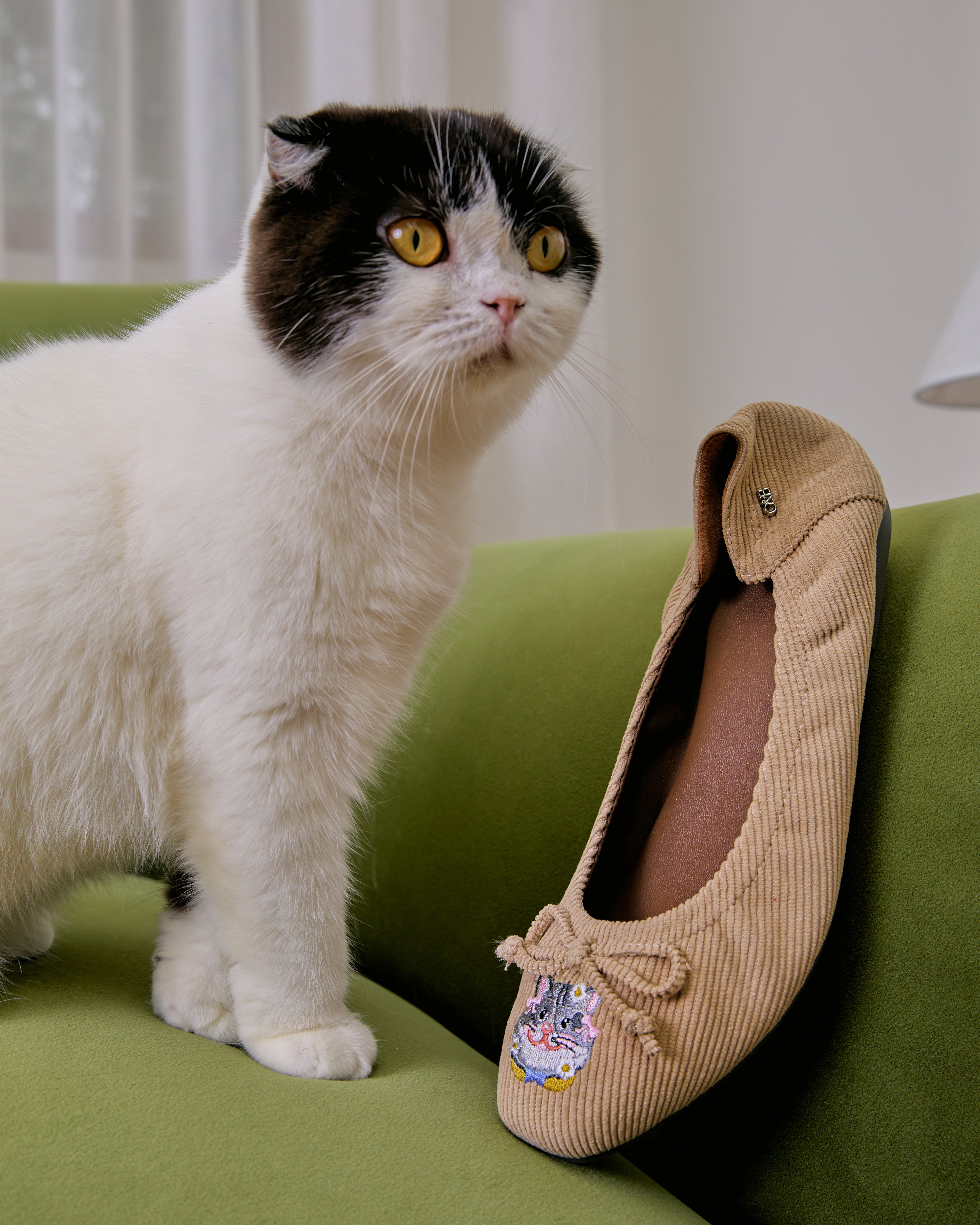 Audrey My Booo รองเท้าผ้าทอลายล่อง Texture นุ่มฟูคุณภาพพิเศษผสาน insole หนังแกะแท้สีสันสดใสตัดกับด้านนอกโดดเด่นด้วยงานปักลายน้องหมาและน้องแมวสุดคิ้วท์ แต่งโบว์เพิ่มลูกเล่นให้คออมพลีตลุคสนุกและมีสไตล์