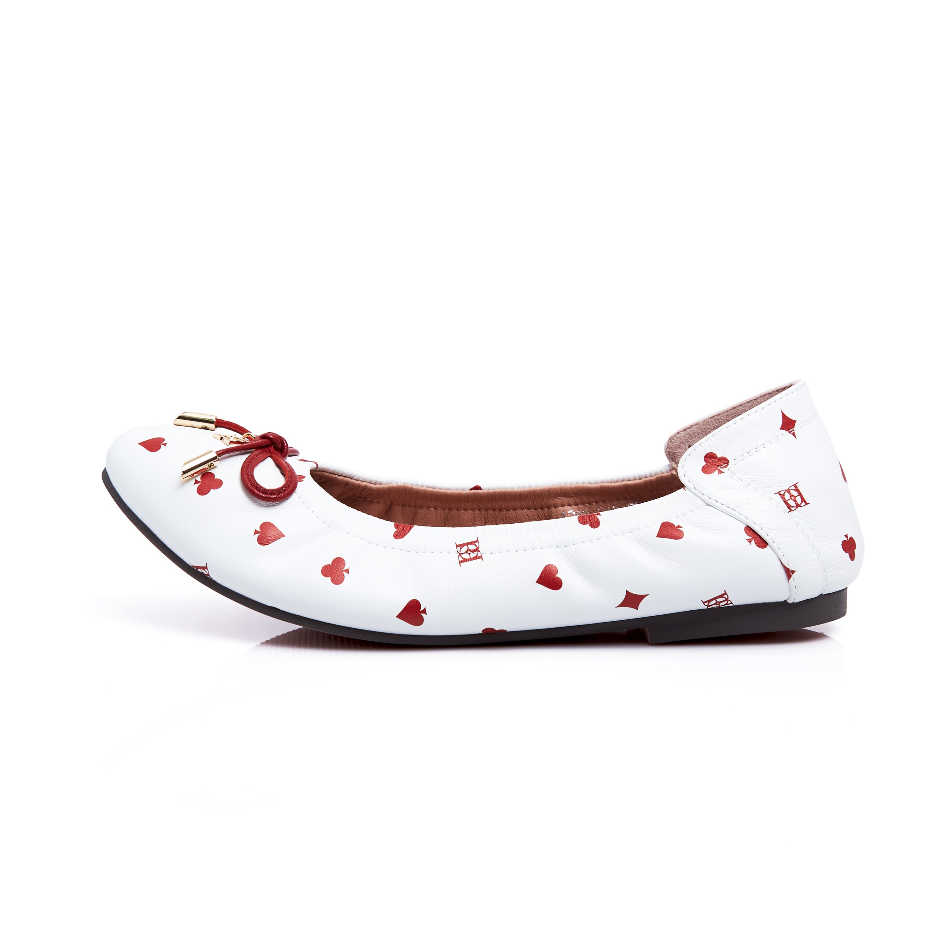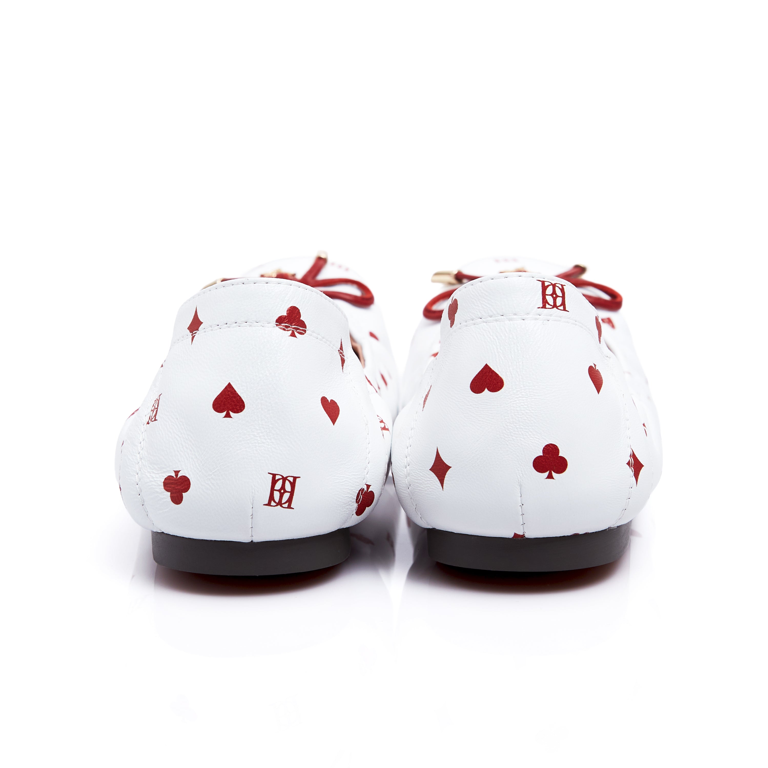 Audrey Poker รองเท้าหนังแกะแท้ โดดเด่นด้วยลายไพ่ปริ้นใน 3 โทสี ขาว ดำ และแดง ประดับด้วยโบว์ด้านหน้าและชาร์มโลโก้เครส เพิ่มความหรูและความสนุกแบบมีคาแร็กเตอร์