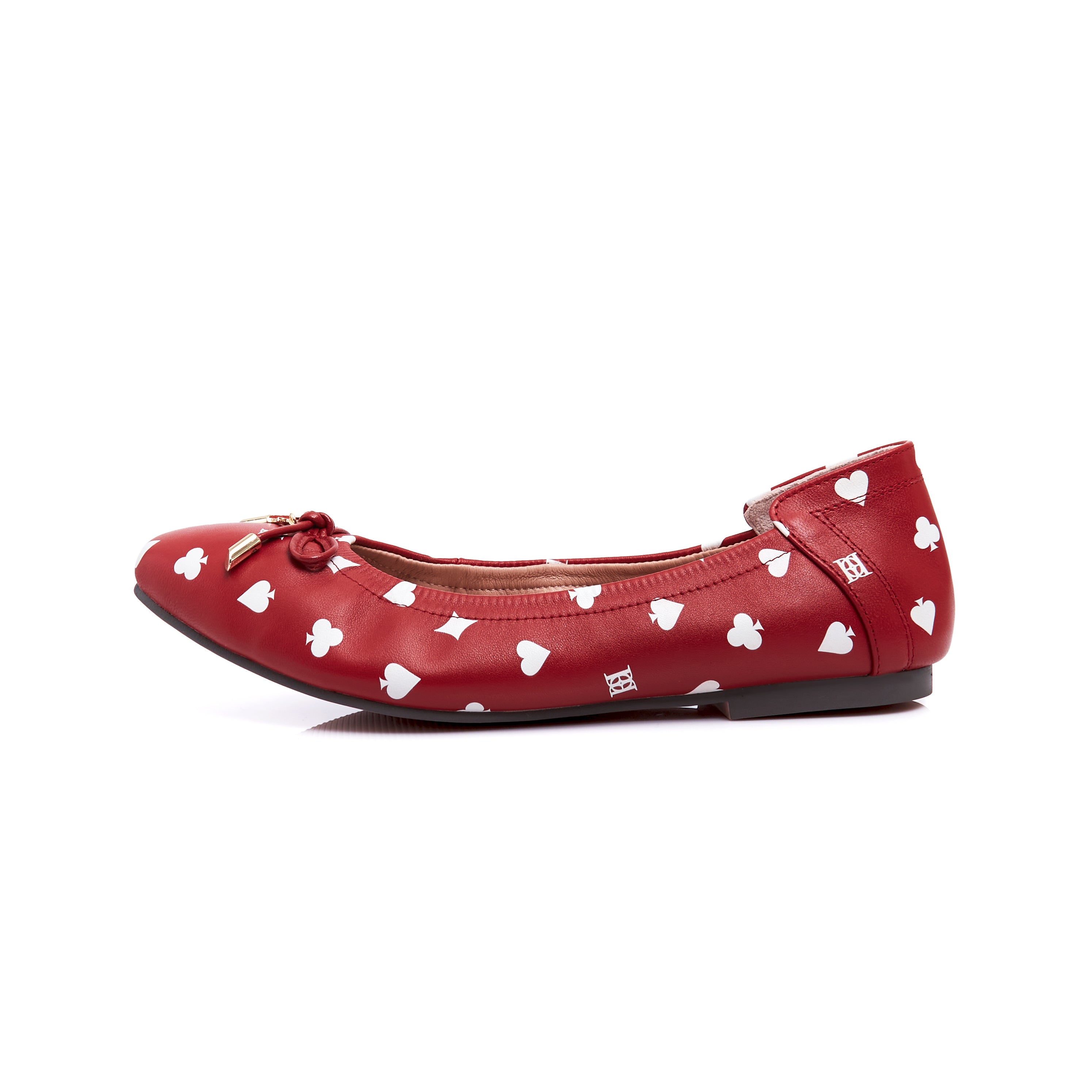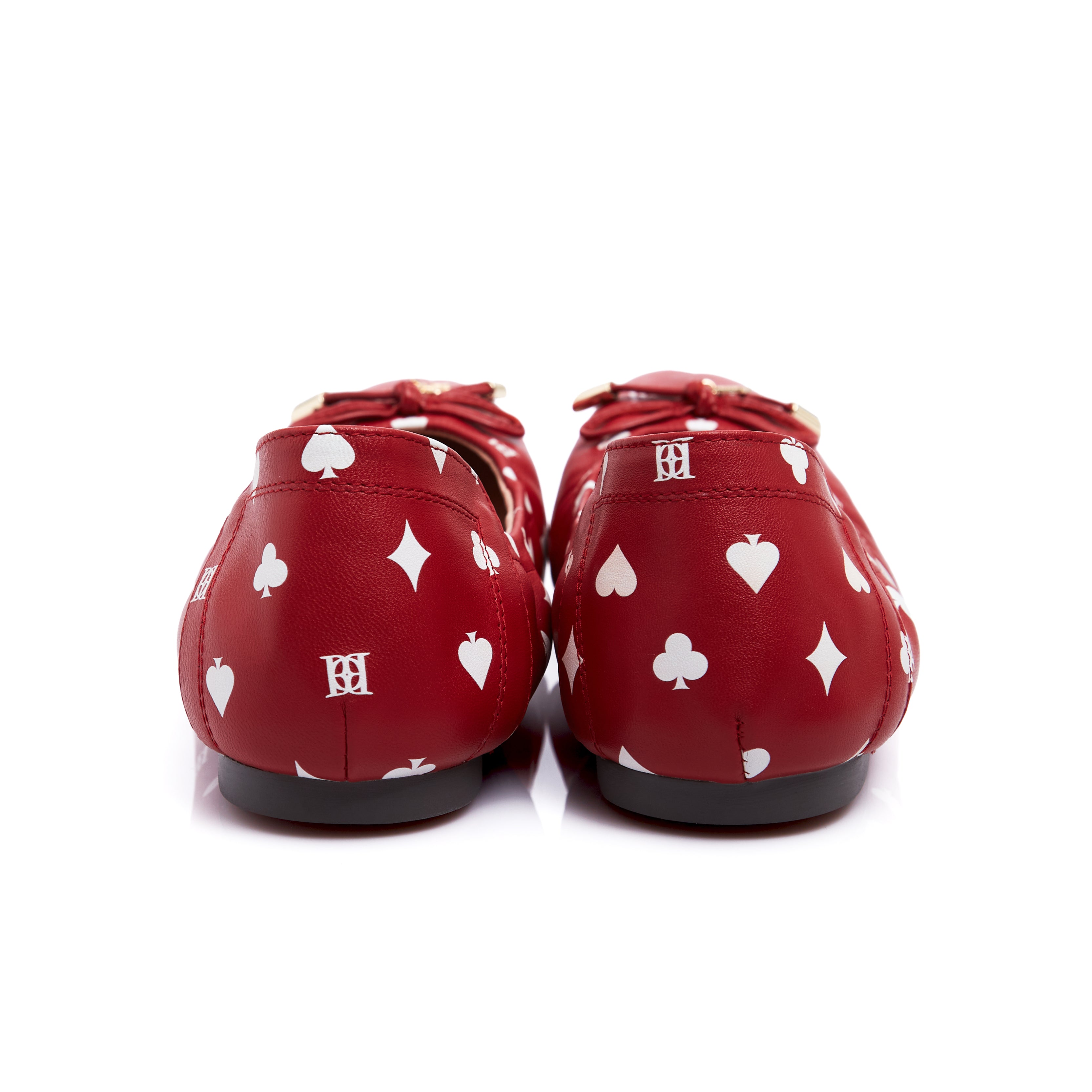 Audrey Poker รองเท้าหนังแกะแท้ โดดเด่นด้วยลายไพ่ปริ้นใน 3 โทสี ขาว ดำ และแดง ประดับด้วยโบว์ด้านหน้าและชาร์มโลโก้เครส เพิ่มความหรูและความสนุกแบบมีคาแร็กเตอร์